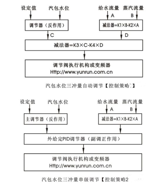 ⑨在负荷大幅度改变时,观察副调的曲线,防止震荡的发生这个阶段容易被忽视,但是非常重要!负荷大幅度波动时候,流量最容易引起震荡,此时减弱副调的比例作用,直到不发生震荡为止,然后为了安全,再次稍微减弱副调作用。在调节副调的同时,还需要注意改变主调的比例作用。⑩注意修改主调的积分作用在反复整定主调、副调比例参数之后,要记得积分 作用也需要修改。如果副调的比例作用减弱,那么积分作用也要相应减弱,因为调节器的输出是比例和积分相权衡的结果。至此水位三冲量调节系统基本调试结束。为了防止副调震荡,还可以对副调的反馈系数和前馈系数进行修改,基本同减弱副调比例带的作用相当。切记在修改系数时一定要把该系统切换为手动运行方式,否则可能对调节器造成较大干扰,甚至危害锅炉安全运行。