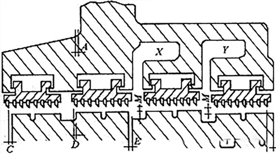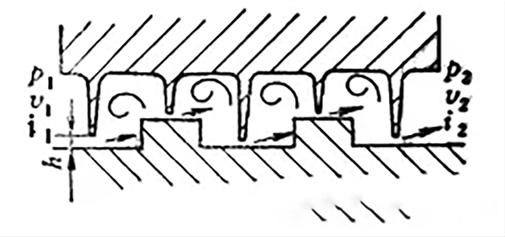 气体穿过齿顶间隙进入空腔,由于容积突然扩大,气体膨胀而产生剧烈的漩涡。在容积比间隙容积大很多的空腔中气体流速几乎等于零,这时,气流的绝大部分动能转化为热能,被腔室中的气体吸收,气体温度又从流经间隙时的温度回升到流入间隙前的温度,在空腔内的压力却回升很小,使气流的焓值保持接近于间隙前的数值。气流残存小部分动能,以余速穿过下一级齿顶间隙继续降低压力和流量。经过一级一级地重复上述节流及等焓热力学过程,使气体的残余速度非常低,气体压力逐渐降低,最终气体的外漏量非常小,起到了密封作用。
