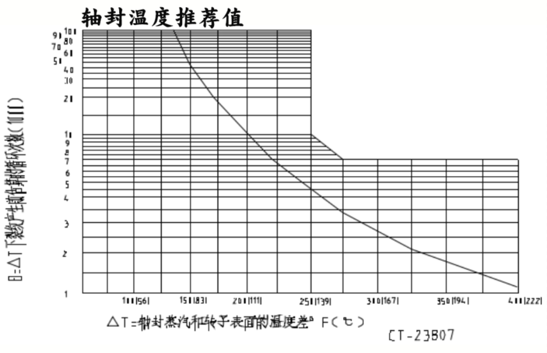 a.轴封蒸汽母管压力0.023~0.032MPa。d.轴封加热器汽侧负压。正常运行时真空在500~750Pa范围之内,通常是690Pa。i.低压缸汽封供汽温度120~180℃,低压汽封温度控制器整定值为150℃。j.为了防止汽封部位由于热应力而造成转子损坏,机组在启动和停机时,要尽量减小汽封蒸汽和转子表面间的温差下,由于热应力而使转子开始产生裂纹的计算循环次数,由图2-12的曲线确定。建议转子循环疲劳能力为10000次。k.如果热态启动采用辅助锅炉向轴封供汽,则应注意辅助锅炉所供蒸汽的温度也不得使轴封蒸汽与转子表面金属的最大允许温差超过上述规定。