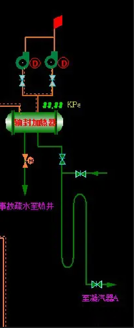 本系统采用两台100%容量轴封风机(其中一台备用)。作用是用以抽出轴封加热器内的不凝结气体,以保证轴封加热器在良好的换热条件下工作,并维持汽封腔室一定的负压,使轴封汽的外挡漏气不向外冒汽。
