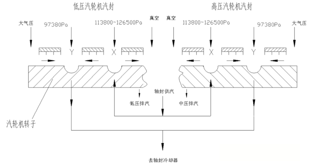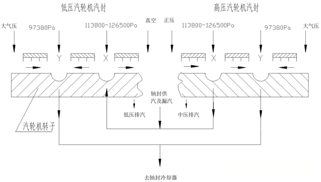 在汽轮机起动和低负荷时所有汽缸中压力都低于大气压力。密封汽供到“X”腔室,通过汽封片一边漏入汽轮机,另一边漏到“Y”腔室。“Y”腔室与轴封加热器相连,轴加风机抽吸此漏气,控制该室压力具有一定的真空度。因而,外界空气通过外部汽封片漏入“Y”腔室后,与从“X”腔室来的密封蒸汽混合,再流向轴封冷却器。随着机组负荷的增加,调速汽阀开大,进汽量增加,汽缸内压力相应增大。当高中压缸两端的排汽压力高于“X”腔室压力时,汽流在内汽封环内发生相反流动,缸内的蒸汽经过汽封流向“X”腔室。轴封系统采用压力和温度是自动控制的自密封系统。设有轴封压力自动调整装置、高低压轴封蒸汽温度自动调节装置、溢流泄压装置和轴封抽气装置,轴封用汽进口处设有永久性蒸汽过滤器。轴封用汽系统包括轴封汽源切换用的电动隔绝阀、减压阀、旁路阀、泄压阀和其它阀门以及仪表、减温设备和有关附属设备等,系统供汽母管还设有安全阀,可防止供汽压力过高而危及机组安全。另外设置一台100%容量的轴封蒸汽冷却器,两台100%容量的轴加风机,用以排出轴封蒸汽冷却器内的不凝结的气体,两台电动排气风机互为备用。汽封系统疏水采用经常疏水,且采用自动疏水器。
